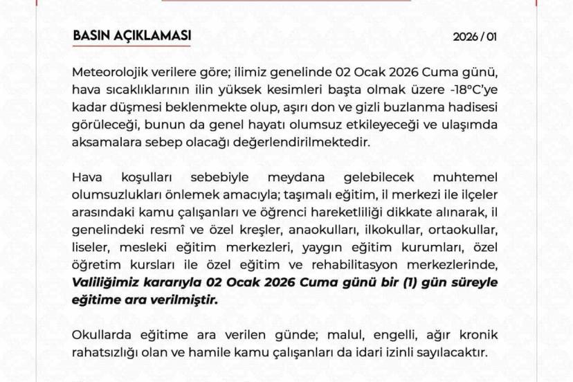 Valilikten yapılan açıklamada, hava sıcaklıklarının özellikle ilin yüksek kesimlerinde eksi 18 dereceye kadar düşmesinin beklendiği, aşırı don ve gizli buzlanma hadiselerinin görülebileceği, bu durumun günlük yaşamı olumsuz etkileyebileceği ve ulaşımda aksamalara yol açabileceği ifade edildi. Oluşabilecek muhtemel olumsuzlukların önüne geçilmesi amacıyla alınan kararla, il genelindeki resmi ve özel kreşler, anaokulları, ilkokullar, ortaokullar, liseler, mesleki eğitim merkezleri, yaygın eğitim kurumları, özel öğretim kursları ile özel eğitim ve rehabilitasyon merkezlerinde eğitime 2 Ocak 2026 Cuma günü 1 gün süreyle ara verildiği bildirildi.