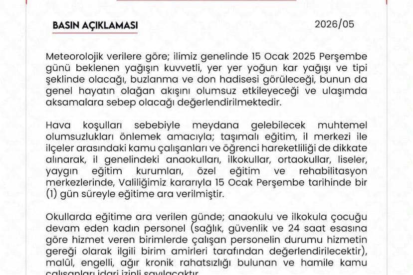 Valilikten yapılan açıklamada muhtemel risklerin önüne geçilmesi amacıyla il genelindeki anaokulları, ilkokullar, ortaokullar, liseler, yaygın eğitim kurumları ile özel eğitim ve rehabilitasyon merkezlerinde 15 Ocak Perşembe günü eğitime ara verilmesine karar verildiği ifade edildi.
