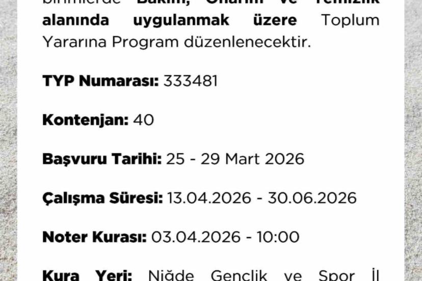 Bunun yanı sıra Niğde Gençlik ve Spor İl Müdürlüğü’ne bağlı birimlerde yürütülecek Toplum Yararına Program (TYP) kapsamında da 40 kişilik istihdam sağlanacak. Bakım, onarım ve temizlik alanlarında görev alacak personel için başvurular 25-29 Mart 2026 tarihleri arasında alınacak. Programın 13 Nisan - 30 Haziran 2026 tarihleri arasında uygulanacağı belirtilirken, katılımcılar 3 Nisan 2026 tarihinde yapılacak noter kurası ile belirlenecek. Kura çekiminin Niğde Gençlik ve Spor İl Müdürlüğü Konferans Salonu’nda yapılacağı bildirildi.