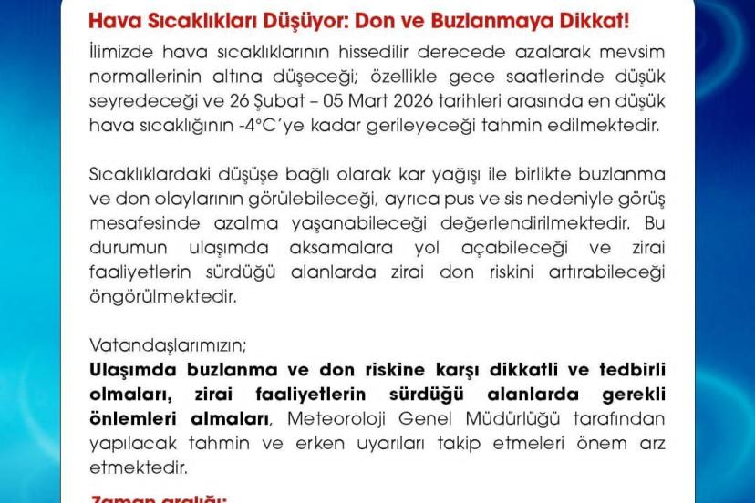 Niğde Valiliği tarafından yapılan açıklamada vatandaşların ulaşımda buzlanma ve don riskine karşı dikkatli ve tedbirli olmaları, çiftçilerin ise zirai faaliyetlerin sürdüğü alanlarda gerekli önlemleri almaları gerektiği vurgulandı, meteorolojik tahmin ve erken uyarıların takip edilmesinin önem taşıdığı belirtildi.