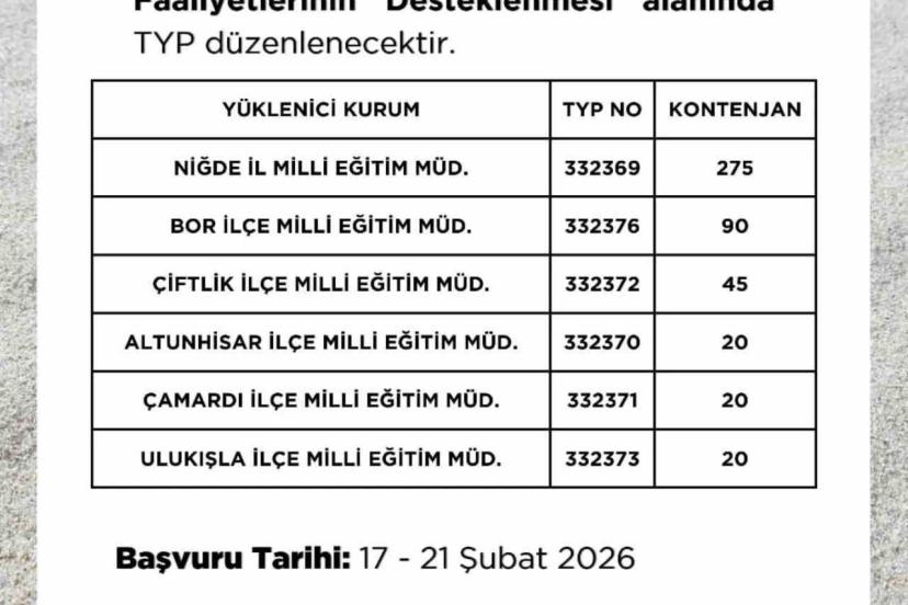 Niğde İŞKUR İl Müdürlüğü tarafından yapılan açıklamaya göre program çerçevesinde Niğde İl Milli Eğitim Müdürlüğü için 275, Bor İlçe Milli Eğitim Müdürlüğü için 90, Çiftlik İlçe Milli Eğitim Müdürlüğü için 45, Altunhisar, Çamardı ve Ulukışla İlçe Milli Eğitim Müdürlükleri için ise ayrı ayrı 20’şer kontenjan ayrıldı. Böylece kent genelinde toplam 470 kişilik istihdam sağlanacak. Başvurular 17 - 21 Şubat 2026 tarihleri arasında alınacak. Program kapsamında işe başlayacak katılımcılar 2 Mart 2026 tarihinde görevlerine başlayacak ve 26 Haziran 2026 tarihine kadar okullarda görev yapacak.