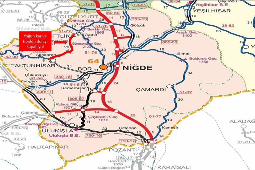 26 Şubat 2026 tarihi saat 10.15 itibarıyla, Niğde-Çiftlik İl Yolu’nun 8 ile 32’nci kilometreleri arasındaki bölüm ile Çiftlik-Altunhisar İl Yolu’nun 32 ile 56’ncı kilometreleri arasındaki bölüm trafiğe kapatıldı.