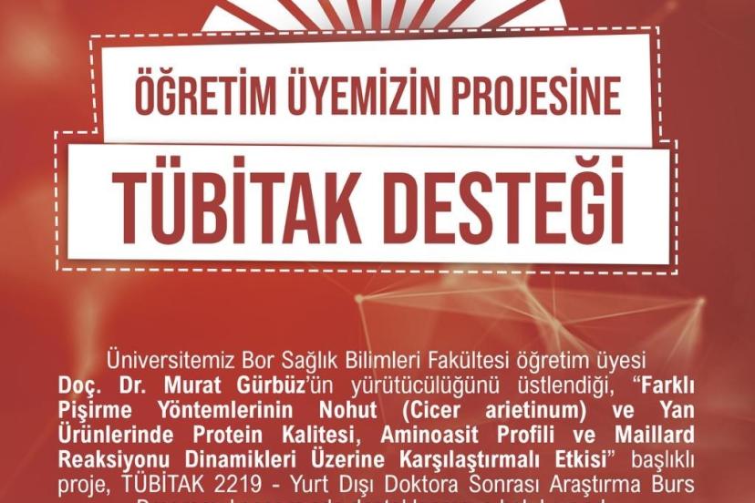Niğde Ömer Halisdemir Üniversitesi Bor Sağlık Bilimleri Fakültesi öğretim üyesi Doç. Dr. Murat Gürbüz’ün yürütücülüğünü üstlendiği, "Farklı Pişirme Yöntemlerinin Nohut (Cicer arietinum) ve Yan Ürünlerinde Protein Kalitesi, Aminoasit Profili ve Maillard Reaksiyonu Dinamikleri Üzerine Karşılaştırmalı Etkisi" başlıklı proje, TÜBİTAK 2219-Yurt Dışı Doktora Sonrası Araştırma Burs Programı kapsamında desteklenmeye hak kazandı.