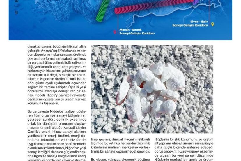 Makalesinde Türkiye’nin kuzeyinden güneyine uzanan Samsun-Mersin sanayi hattı kapsamında planlanan mega endüstri bölgelerinin yeni bir üretim vizyonu ortaya koyduğunu belirten Uslu, Niğde’nin bu hat üzerinde stratejik bir konumda bulunduğunu ifade ederek bu durumun şehir için önemli bir kalkınma fırsatı sunduğunu kaydetti.