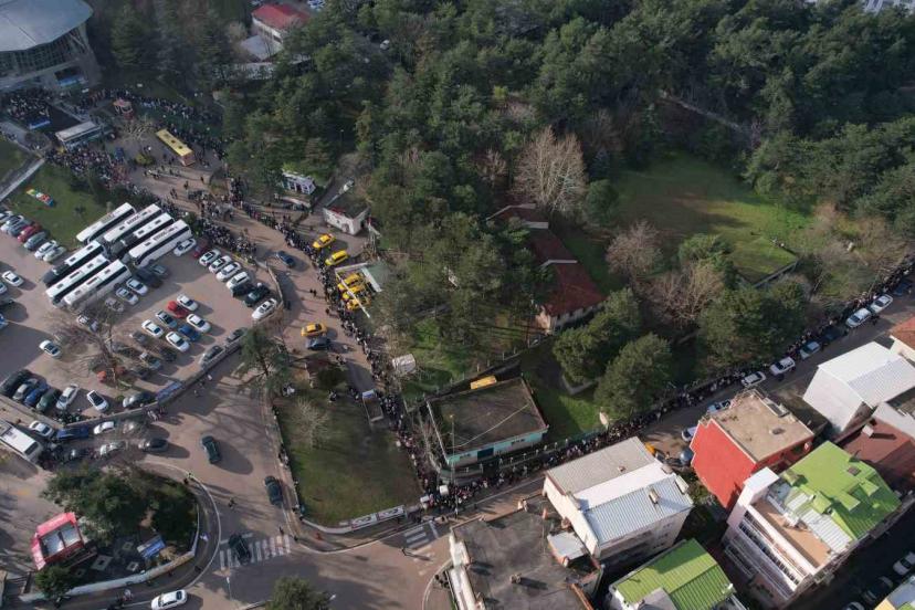 Yaklaşık 1 kilometreyi bulan kuyrukta teleferiğe binmek için bekleyenler, dron ile havadan da görüntülendi.