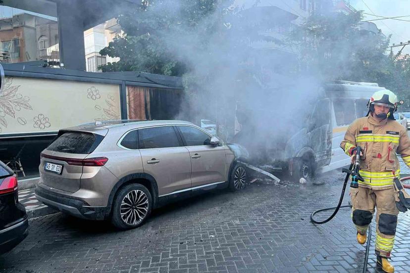 İtfaiye ekiplerinin müdahalesiyle yangın kontrol altına alınırken, midibüs ve yakınında park halinde bulunan bir otomobil yanarak kullanılamaz hale geldi.