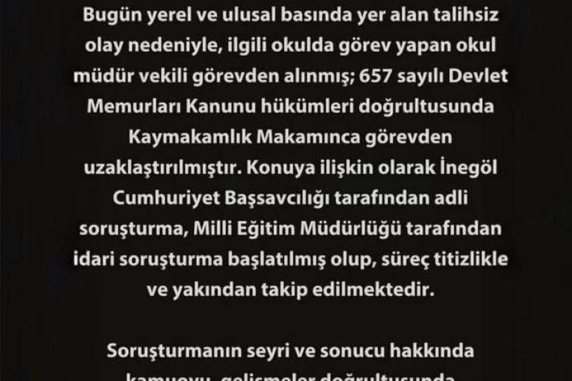 İlçe Milli Eğitim Müdürlüğünden yapılan yazılı açıklamada, "Bugün yerel ve ulusal basında yer alan talihsiz olay nedeniyle ilgili okulda görev yapan okul müdür vekili görevden alınmış; 657 sayılı Devlet Memurları Kanunu hükümleri doğrultusunda kaymakamlık makamınca görevden uzaklaştırılmıştır. Konuya ilişkin olarak İnegöl Cumhuriyet Başsavcılığı tarafından adli soruşturma, Milli Eğitim Müdürlüğü tarafından idari soruşturma başlatılmış olup, süreç titizlikle ve yakından takip edilmektedir. Soruşturmanın seyri ve sonucu hakkında kamuoyu, gelişmeler doğrultusunda bilgilendirilecektir" denildi.