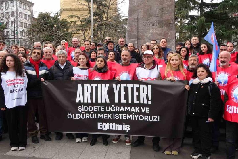 Eğitim-İş Trabzon Şubesi üyeleri, İstanbul’un Çekmeköy ilçesinde bulunan Taşdelen Borsa İstanbul Mesleki ve Teknik Anadolu Lisesi’nde görev yapan öğretmen Fatma Nur Çelik’in okul içerisinde uğradığı saldırı sonucu hayatını kaybetmesine tepki gösterdi.