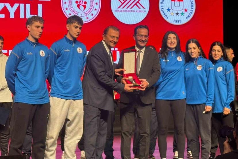 TÜSF Başkanı Prof. Dr. Mutlu Türkmen tarafından takdim edilen ödül, OMÜ Genel Sekreteri Erhan Burak Pancar ile Avrupa’da madalya kazanan sporcuların katılımıyla sahnede teslim alındı.