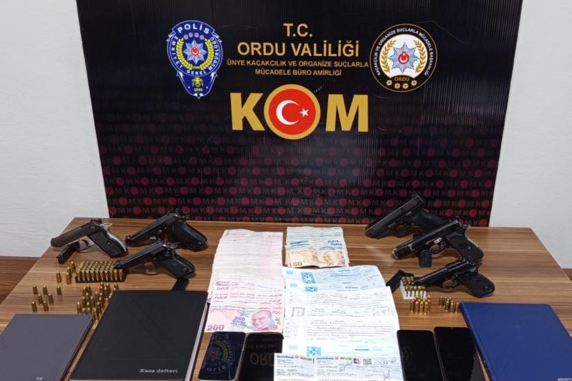 Ünye Cumhuriyet Başsavcılığı koordinesinde, İl Emniyet Müdürlüğü Kaçakçılık ve Organize Suçlarla Mücadele Şube Müdürlüğü tarafından tefecilik suçuna yönelik yürütülen çalışmalar kapsamında, Ünye ilçesinde 8 adrese yönelik operasyon gerçekleştirildi. Operasyonlarda, 6 adet ruhsatsız tabanca, 42 bin 100 TL para, 120 adet fişek, çok sayıda senet ve alacak verecek defteri ele geçirildi.
