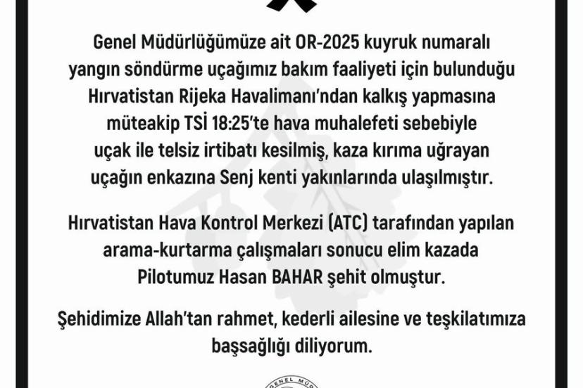 Orman Genel Müdürü Karacabey sosyal medya hesabından yaptığı paylaşımında, "Genel Müdürlüğümüze ait OR-2025 kuyruk numaralı yangın söndürme uçağımız bakım faaliyeti için bulunduğu Hırvatistan Rijeka Havalimanı’ndan kalkış yapmasına müteakip saat 18.25’te hava muhalefeti sebebiyle uçak ile telsiz irtibatı kesilmiş, kaza kırıma uğrayan uçağın enkazına Senj kenti yakınlarında ulaşılmıştır. Hırvatistan Hava Kontrol Merkezi (ATC) tarafından yapılan arama-kurtarma çalışmaları sonucu elim kazada Pilotumuz Hasan Bahar şehit olmuştur. Şehidimize Allah’tan rahmet, kederli ailesine ve teşkilatımıza başsağlığı diliyorum" ifadelerini kullandı.