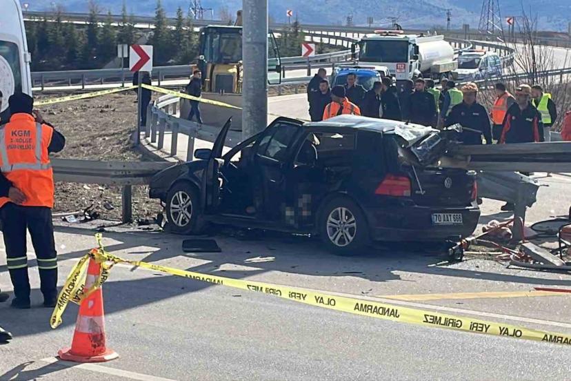 Karaman’da kontrolden çıkan otomobil bariyerlere ok gibi saplandı. Feci kazada anne ve baba olay yerinde hayatını kaybederken, 3 yaşındaki kızları yaralandı.