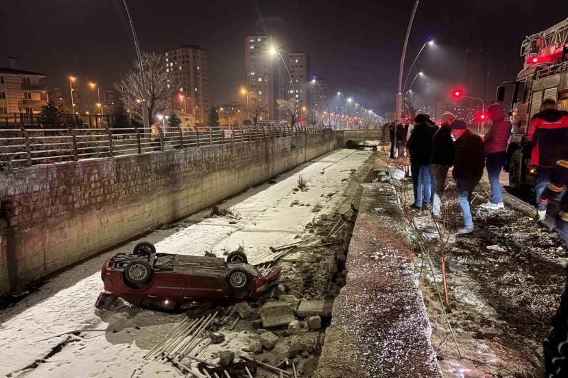 Kayseri’nin Kocasinan ilçesinde sürücüsünün direksiyon hakimiyetini kaybettiği otomobil 5 metrelik kanala uçarken, sürücü kaz...