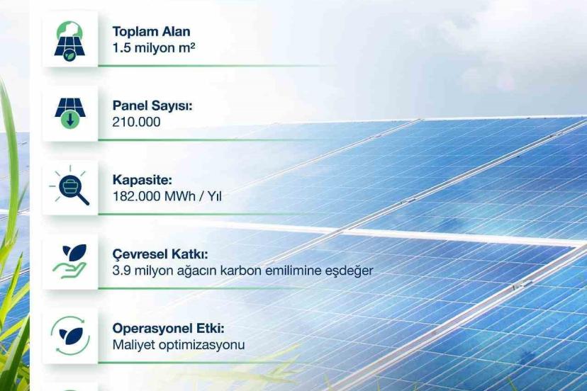 Bu yatırım, Türkiye’de bir sanayi üreticisi tarafından tek lokasyonda ve münhasıran, öz tüketim amaçlı önde gelen yenilenebilir enerji projelerinden biri olma özelliğini taşıyor. Yaklaşık 210 futbol sahası büyüklüğüne denk gelen 1 milyon 500 bin metrekare alan üzerine kurulan tesiste; 210 bin 834 adet güneş paneli, yaklaşık 2 milyon metre kablo ve 4.900 ton çelik kullanıldı. Yıllık 182 bin MWh temiz enerji üretimi gerçekleştirmesi beklenen santral, yaklaşık 3,9 milyon ağacın yıllık karbon emilimine eşdeğer bir çevresel fayda sağlayacak. Operasyonel maliyetlerde ciddi bir enerji avantajı oluşturması beklenen projenin, OYAK Çimento Fabrikaları A.Ş.’nin toplam enerji kullanımındaki yenilenebilir enerji payını yüzde 25 seviyesine yükseltmesi öngörülüyor.