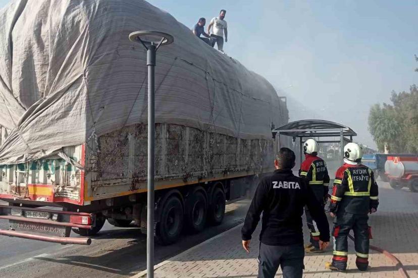 Aydın’ın Germencik ilçesinde pamuk yüklü tırda çıkan yangın, itfaiyenin hızlı müdahalesiyle büyümeden söndürüldü.