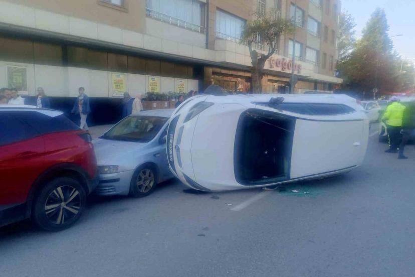 Park halindeki araçlara çarpan otomobil yan yattı: 1 yaralı