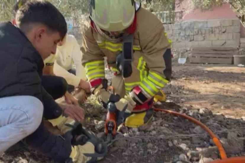Hatay’da patisi zincire sıkışan köpeğin yardımına itfaiye yetişti.