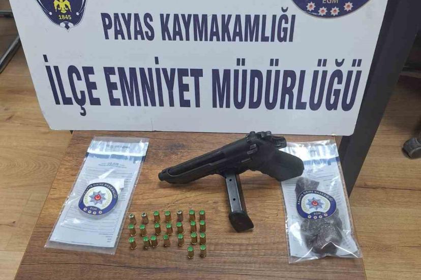 Hatay Emniyet Müdürlüğü görevlilerince uyuşturucu madde kullanımının ve ticaretinin önlenmesine yönelik yürütülen çalışmada; Payas ilçesinde durumundan şüphelenerek durdurulan ve içerisinde 3 kişi bulunan otomobil’de yapılan aramada; 1 adet kurusıkı tabanca, 23 adet fişek, 11,9 gram uç diye tabir edilen uyuşturucu madde ele geçirildi.