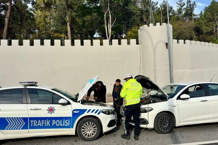 Bilecik’te polis ekipleri, yolda arızalanan otomobile akü takviyesi yaptı.