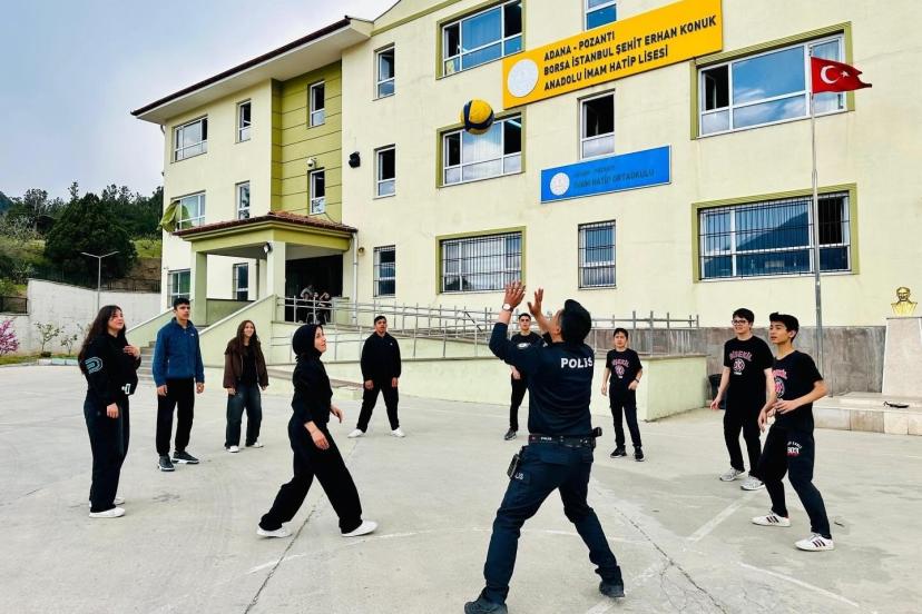 Adana’nın Pozantı ilçesinde polis memuru, lise öğrencileriyle voleybol oynayarak gençlerin heyecanına ortak oldu.