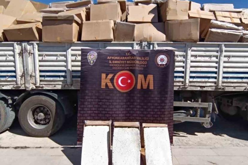 Afyonkarahisar’da polis ekipleri durdukları tırda piyasa değeri yaklaşık 8 milyon TL olan doldurulmuş makaron ele geçirdi.