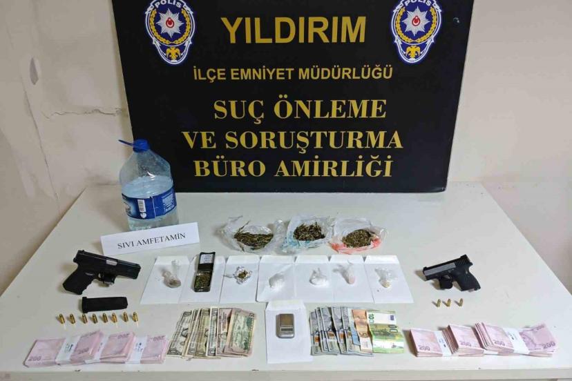 Bursa Emniyet Müdürlüğü Yıldırım İlçe Emniyet Müdürlüğü’ne bağlı Yıldırım Suç Önleme ve Soruşturma Büro Amirliği ekiplerince yapılan çalışmalarda, Yeşil Mahallesi’nde bulunan bir ikamette, hakkında farklı suçlardan 4 yıl 2 ay kesinleşmiş hapis cezası bulunan Yelid A.’nın saklandığı aynı adreste, uyuşturucu madde ticareti yapıldığı ve ruhsatsız silah bulundurulduğu bilgisine ulaşıldı.