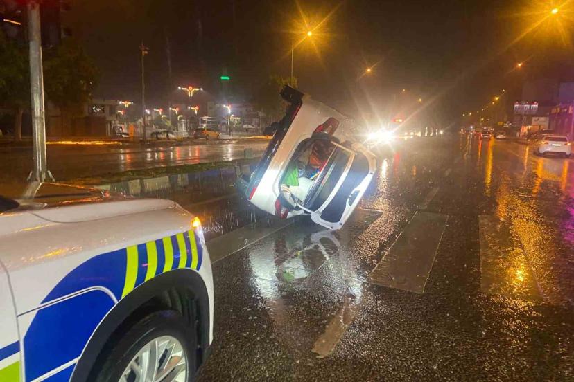 Antalya’nın Serik ilçesinde kontrolden çıkan bir otomobilin refüje çarparak yan yatması sonucu meydana gelen kazada, sürücü v...