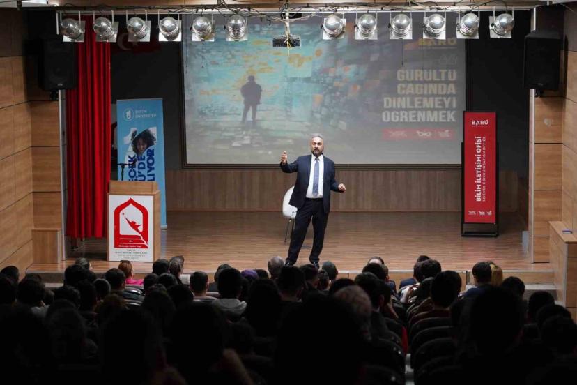 Öğrencilerin yoğun katılımıyla gerçekleştirilen programda Rektör Prof. Dr. Ahmet Akkaya, konuşmasına dinlemenin insan hayatındaki temel yerini anlatarak başladı. Gençlere dinleme becerisi hakkında bilgiler veren Rektör Akkaya, "İlk öğrendiğimiz beceri dinlemedir. Dinlemeden konuşmayı, okumayı ve yazmayı geliştiremeyiz. Eğer iyi bir dinleyici olmazsak iyi bir konuşmacı da olamayız. İnanılmaz bir gürültü çağında yaşıyoruz. 50 yıl önceki gibi hiçbirimiz kuş cıvıltılarının olduğu, ağaçlardaki o muhteşem hışırtı sesiyle karşı karşıya değiliz. Tabiatta değiliz, insanın yapay dünyasındayız. Bizim zamanımızda ders çalışırken bizi uyarıcı nesneler çok yoktu. Ancak bugün sizin çoklu uyaranlarla karşı karşıya olduğunuz gerçeği var" dedi.
