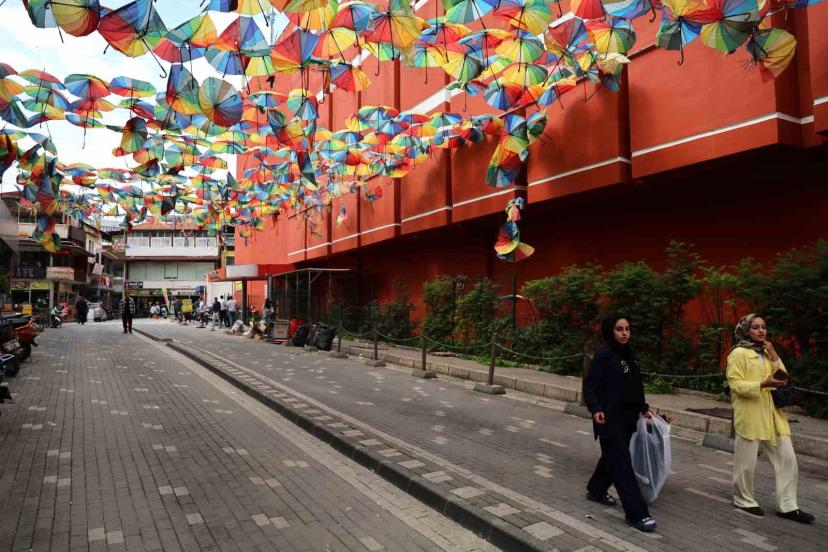 Adana’da renkli şemsiyelerle kaplı sokak, şiddetli yağış ve fırtına sonrası harabeye döndü.