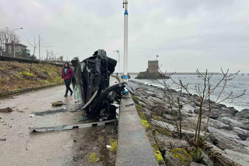 Rize’de takla atan otomobil beton bariyere çarparak denize uçmaktan kurtuldu