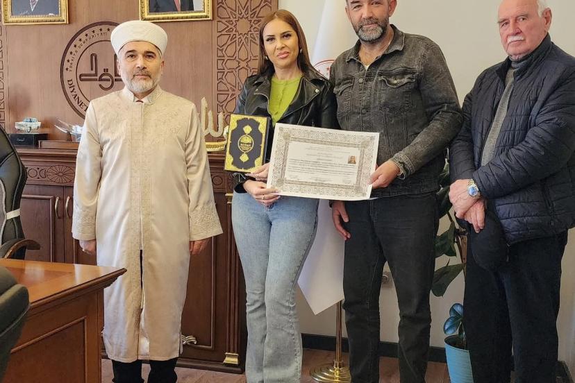 Programın sonunda İl Müftüsü Muharrem Gül tarafından Aleyna’ya İhtida Belgesi takdim edilerek Rusça Kur’an-ı Kerim meali ve çeşitli dini yayınlar hediye edildi. Merasim yapılan dua ile sona erdi.
