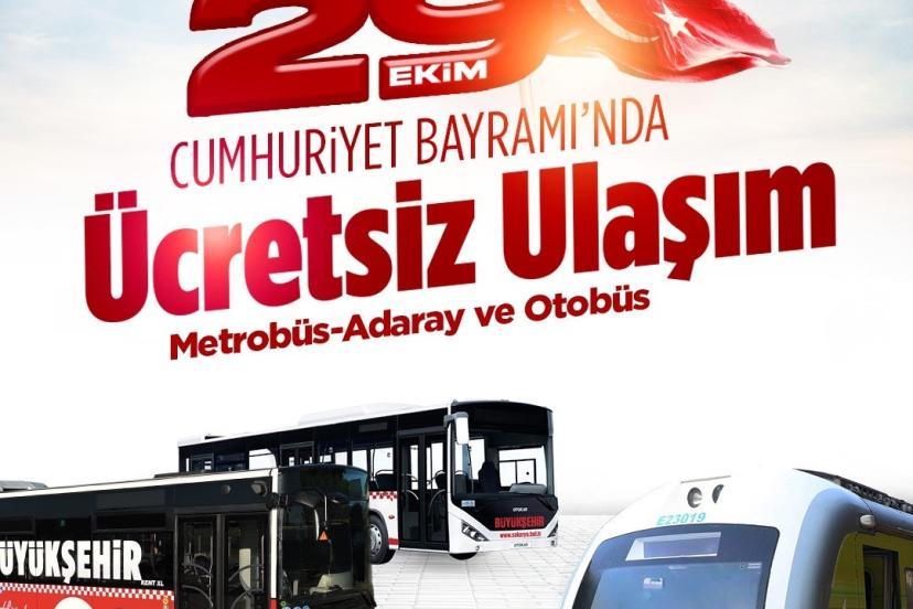 Sakarya Büyükşehir Belediyesi, 29 Ekim Cumhuriyet Bayramı’nda vatandaşlara ücretsiz ulaşım hizmeti sunacak. Bayram günü boyunca belediye otobüsleri ve ADARAY seferleri ücretsiz olacak.
