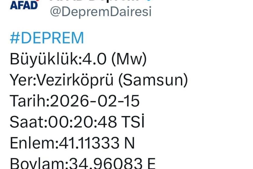 Afet ve Acil Durum Yönetimi Başkanlığı (AFAD) Deprem Dairesi Başkanlığı verilerine göre, saat 00.20.48’de merkez üssü Vezirköprü olan 4.0 (Mw) büyüklüğünde bir deprem kaydedildi. Tahtaköprü Mahallesi batısında, yerin 7 kilometre derinliğinde gerçekleşen sarsıntının enlemi 41.11333 N, boylamı ise 34.96083 E olarak açıklandı.