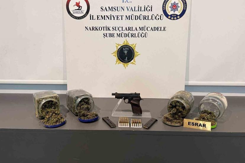 Samsun İl Emniyet Müdürlüğü Narkotik Suçlarla Mücadele Şube Müdürlüğü ekiplerince uyuşturucu ile mücadele kapsamında yürütülen çalışmalarda İlkadım ilçesinde gerçekleştirilen operasyonda, M.K. (55) isimli şahsın ikametinde ve çatı katında arama yapıldı. Yapılan aramalarda 211 gram esrar, 1 adet ruhsatsız tabanca ve 48 adet fişek ele geçirildi. Şüpheli şahıs hakkında adli işlem başlatıldı.