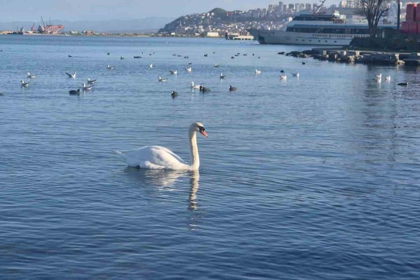 Sahilin dikkat çeken misafirleri arasında, genellikle Sevgi Gölü’nde görülen ve bölgenin maskotu haline gelen beyaz kuğu da yer aldı. Kuğunun kıyıya yaklaşması vatandaşların ilgisini çekerken, elmabaş patka, sakar meke ve su altındaki avcılık yetenekleriyle bilinen batağan kuşları da sahil şeridini mesken tuttu.