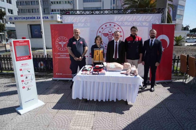 Cumhuriyet Meydanı’nda kurulan OED cihazı Samsun İl Sağlık Müdürü Uzm. Dr. Mustafa Uras, Samsun İl Sağlık Müdürlüğü İlk Yardım Eğitici Eğitmeni Ahmet Duran, İlk Yardım Eğitmeni Selma Öz Güngör ve İl Haberleşme ASELSAN İrtibat Sorumlusu Ambulans ve Acil Bakım Teknikeri Oğuz Çevik tarafından basın mensuplarına tanıtıldı. Cihazlarla ilgili bilgi veren Samsun İl Sağlık Müdürü Uzm. Dr. Mustafa Uras, "Vatandaşımız cihazın kapağını açtığı andan itibaren sistem sadece şok vermekle kalmıyor, aynı zamanda kullanıcıyı 112 Acil Çağrı Merkezi’ni araması konusunda uyarıyor. Müdahale süresince 112 operatörleri ile iletişimde kalmak hem OED cihazının kullanımı hem de temel yaşam desteği adımlarında uygulayıcıya büyük bir güven ve destek sağlıyor. Yani vatandaşımız müdahaleyi yaparken asla yalnız kalmıyor; bir ucu Sağlık Bakanlığımızda olan profesyonel bir yardım zincirinin parçası haline geliyor" dedi.