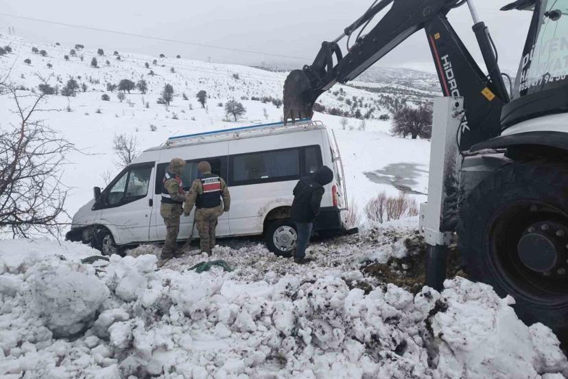 Elazığ’da yoğun kar yağışından dolayı şarampole sürüklenen minibüs, jandarma ve il özel idaresi ekipleri tarafından kurtarıldı.