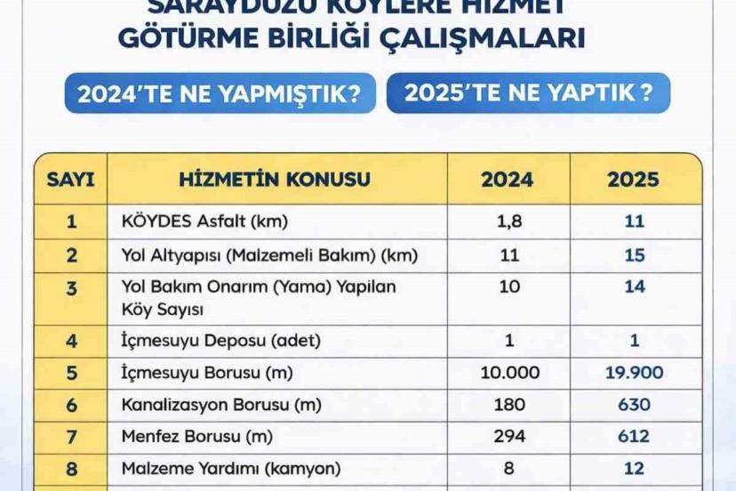 İlçe genelinde yürütülen çalışmalar kapsamında, köy yollarının iyileştirilmesi, içme suyu ve kanalizasyon altyapısının güçlendirilmesi ile yaşam alanlarının daha modern ve güvenli hale getirilmesi hedeflendi. 2025 yılı içerisinde Saraydüzü köylerinde toplam 11 kilometre KÖYDES asfalt çalışması yapılırken, 15 kilometrelik yol bakım ve altyapı çalışması gerçekleştirildi. Ayrıca 14 köyde yol onarım ve yama çalışmaları tamamlandı. Altyapı çalışmaları kapsamında 1 adet içme suyu deposu inşa edilirken, 19 bin 900 metre içme suyu hattı, 630 metre kanalizasyon hattı ve 612 metre menfez yapımı gerçekleştirildi. Köy içi düzenlemeler çerçevesinde ise 2 bin 400 metrekare parke taşı döşemesi yapıldı. Çalışmalara destek amacıyla köylere 12 kamyon malzeme sağlanırken, toplam 781 bin 600 TL nakdi destek aktarıldı.