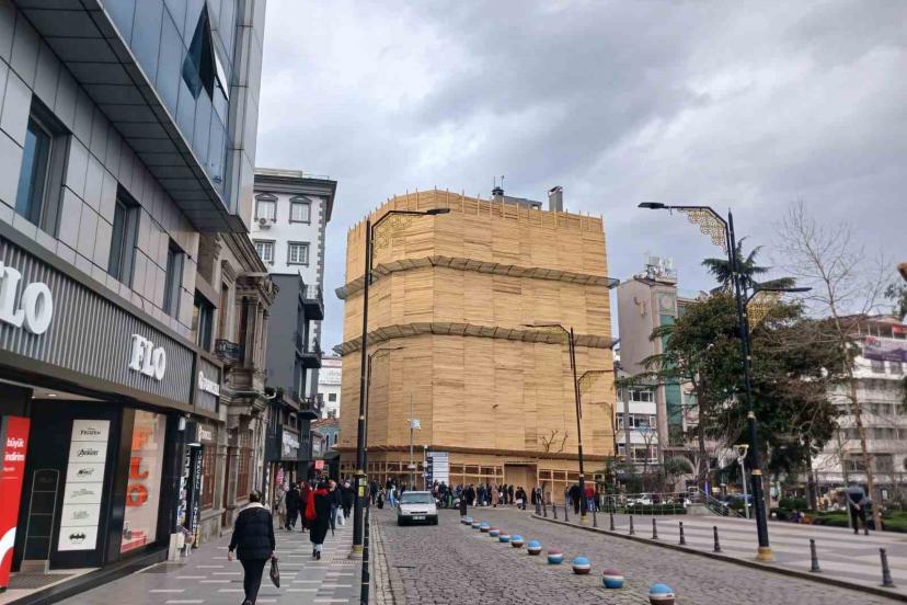 Trabzon kent merkezindeki en işlek noktalarından Uzunsokak’ın girişindeki bir iş merkezinde başlatılan tadilat çalışması nedeniyle tamamen kereste ile kaplanması ilginç bir görüntü oluşturdu. Çalışmalar kapsamında binanın cephesi, güvenlik amacıyla milyonlarca lira değerinde keresteyle kapatılırken, bina görüntüsü ile adeta bir hediye paketini andırdı.