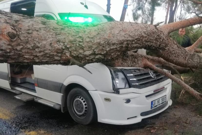 Muğla’nın Yatağan ilçesinde meydana gelen ilginç kazada, seyir halindeki bir dolmuşun üzerine çam ağacı devrildi.