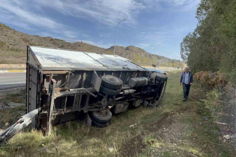 Eskişehir’de kontak anahtarının yerinden çıkması sonucunda direksiyonu kitlenen ve yoldan çıkarak şarampolde yan yatan kamyon...