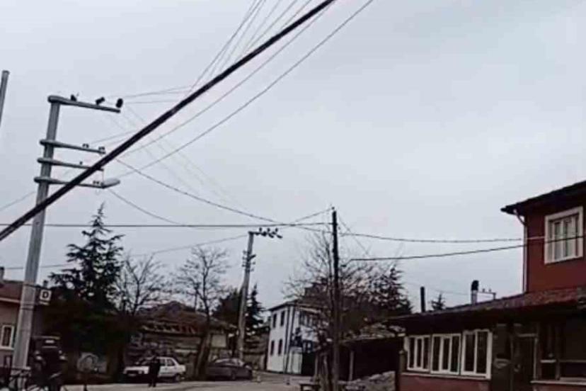 Eskişehir’in Seyitgazi ilçesinde fırtınanın etkisiyle devrilen 30 metrelik bayrak direği, elektrik tellerine çarparak büyük tehlike oluşturdu.