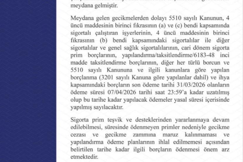 SGK’nın web sitesinde yapılan açıklamaya göre, MOSİP altyapısındaki güncelleme çalışmalarının devam ettiğine dikkat çekilerek, "Meydana gelen gecikmelerden dolayı, 5510 sayılı kanunun 4. Maddesinin 1. fıkrası a ve c bendi kapsamındaki sigortalılar ile 4. Maddesinin 1. fıkrası b bendi sigortalılar ve genel sağlık sigortalılarının, cari dönem sigorta prim ve borçlarının, yapılandırma/taksitlendirme (6183-48’nci madde taksitlendirme borçlarının, diğer her türlü borcun) ihya kapsamındaki borçların, 31 Mart 2026 son ödeme tarihli olanlar 7 Nisan 2026 tarihine kadar uzatılmıştır" denildi.