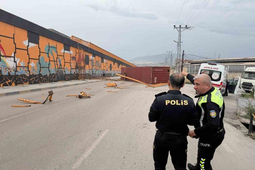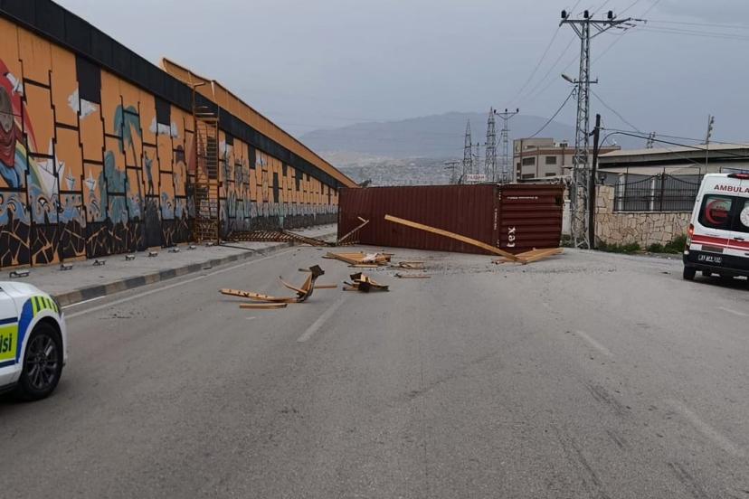 Olay; İskenderun - Payas yolu Akçay bölgesinde yaşandı. Seyir halinde ilerleyen tırın üzerinde bulunan konteyner, kuvvetli fırtınayla uçtu. Tırdan uçan konteyner, köprüden aşağı düştü ve yolu trafiğe kapattı. İhbar üzerine bölgede polis ekipleri tarafından güvenlik önlemi alındı. İskenderun İlçe Emniyet Müdürü Nevzat Güneş’de bölgeye giderek olay yerinde koordinasyonu sağladı. Öte yandan konteynerin tır üzerinden uçtuğu anlarsa seyir halindeki bir aracın kamerasına yansıdı. Konteynerin kaldırılmasıyla yol araç trafiğine yeniden açıldı.