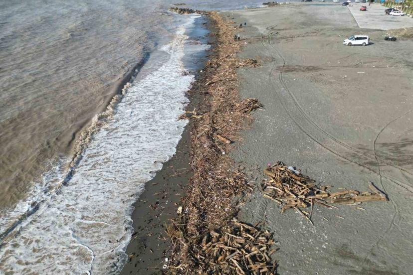 Şiddetli yağışla kahverengiye dönen Akdeniz’de kıyı kütüklerle kaplandı