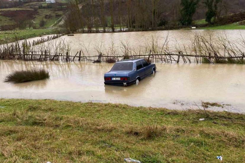 Sinop’ta sağanak yağış sonrası yolda oluşan su birikintisi nedeniyle direksiyon hakimiyeti kaybedilen otomobil, şarampole düşerek suyun içine girdi.
