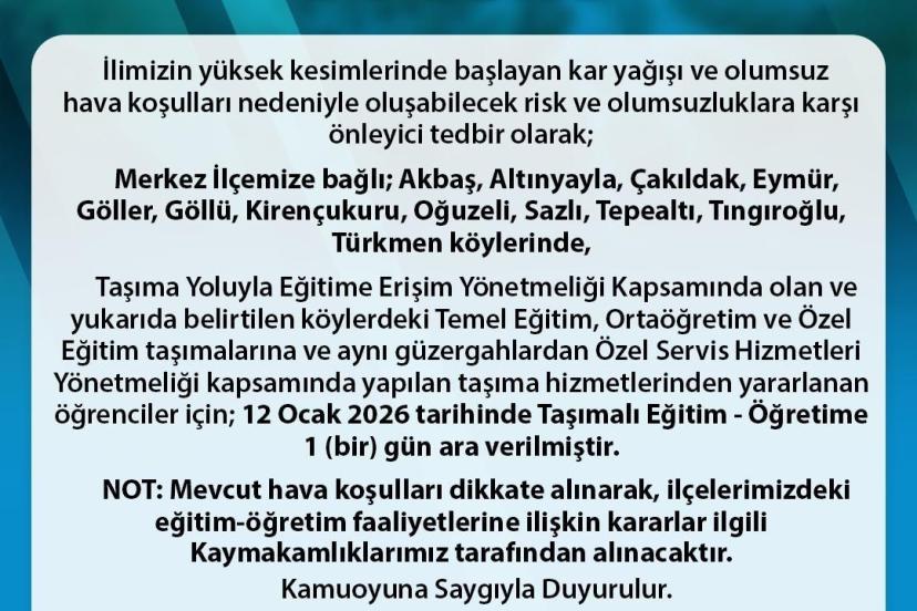 Valilikten yapılan açıklamada, oluşabilecek risk ve olumsuzluklara karşı önleyici tedbir amacıyla karar alındığı belirtildi. Buna göre Merkez ilçeye bağlı Akbaş, Altınyayla, Çakıldak, Eymür, Göller, Göllü, Kirençukuru, Oğuzeli, Sazlı, Tepealtı, Tıngıroğlu ve Türkmen köylerinde Taşıma Yoluyla Eğitime Erişim Yönetmeliği kapsamında gerçekleştirilen temel eğitim, ortaöğretim ve özel eğitim taşımaları durduruldu. Aynı güzergâhlardan Özel Servis Hizmetleri Yönetmeliği kapsamında yapılan öğrenci taşımaları da bu kapsamda değerlendirildi.