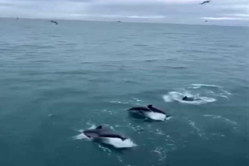 Sinop açıklarında avlanan balıkçılara eşlik eden yunus balıkları sürüsü, denizde görsel şölen oluşturdu. O anlar balıkçılar tarafından cep telefonu kamerasıyla kaydedildi.