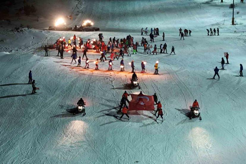 Sivas Yıldız Dağı Kış Sporları Turizm Merkezi’nde resmi sezon açılışı, kar üzerinde oynanan halaylar ve gece kayağı ile başladı.