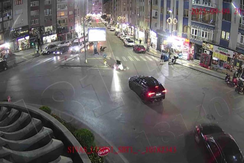 İlk kaza, Sivas Lisesi Kavşağı’nda meydana geldi. Görüntülerde bir otomobilin kavşağa çıktığı ve bu sırada kavşaktan geçmekte olan motosikletle çarpıştığı görüldü. Çarpışmanın etkisiyle motosiklette bulunan iki kişi yere savruldu.